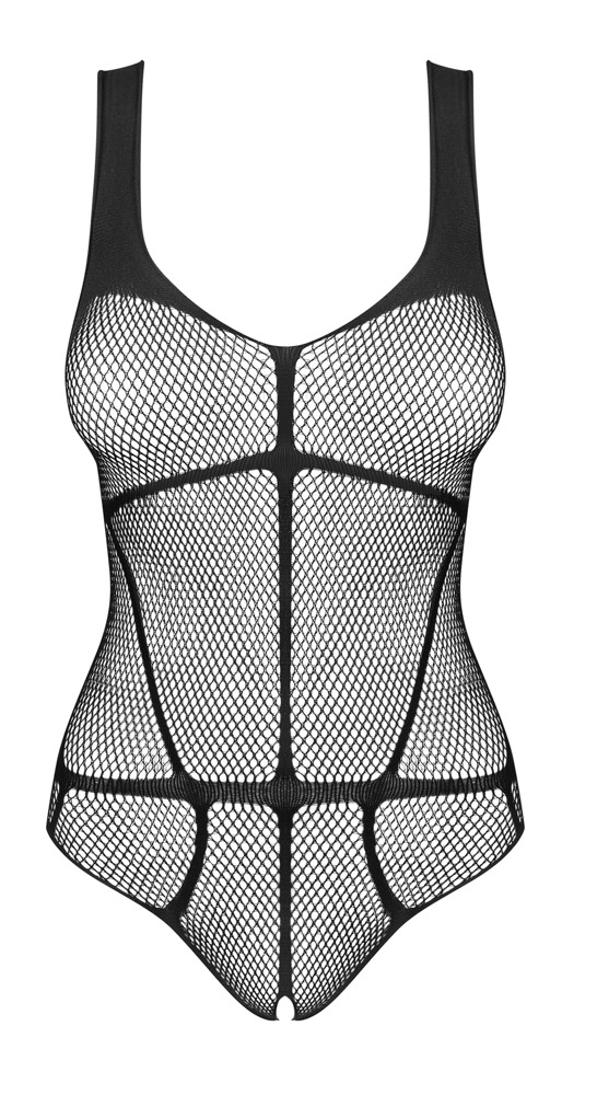 Zwarte, zeer elastische kruisloze body B336 van Obsessive gemaakt van zacht, zijdeachtig mesh. De ingeweven harnaslook benadrukt perfect je rondingen. Opwindend strak model en verleidelijk open bij het kruis.