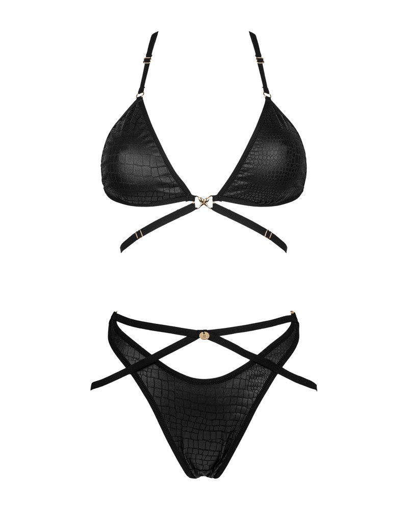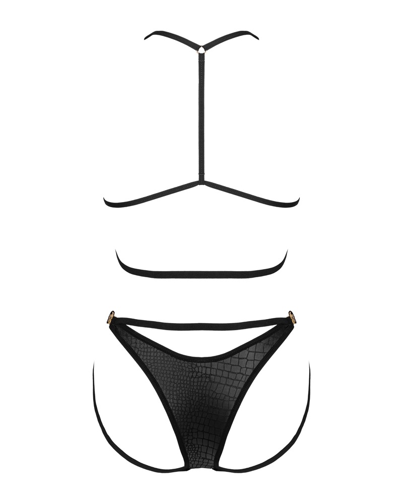 Cobra Nive set van Obsessive met een zachte bh en slip in een zwarte slangenleerlook met elastische bandjes en goudkleurige details. Overal zacht en elastisch voor een hoog draagcomfort. De bh heeft een sluiting aan de voorkant en de bandjes en onderbustebandjes kunnen op maat worden versteld. De strappy-look slip heeft een zijsluiting.