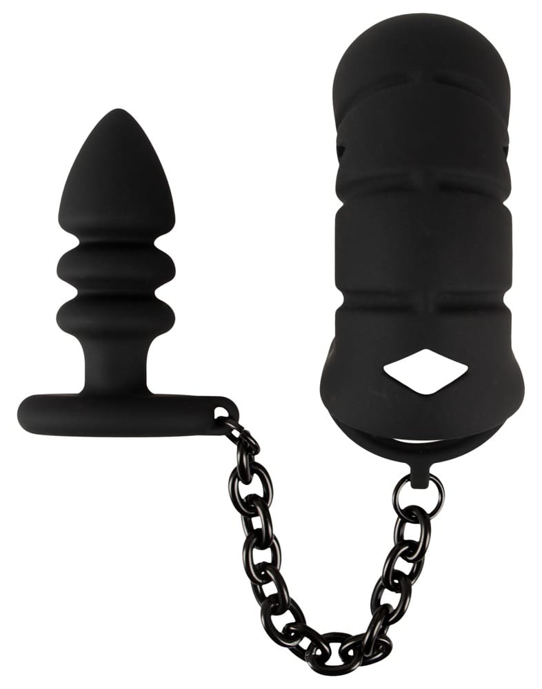 Peniskooi met buttplug van Black Velvets combineert een peniskooi met een testikelring en verbindt deze via een stevige ketting met de uitgesproken geribbelde buttplug. Naast een fantastische draagsensatie is dit ook een zeer opwindend gezicht en opwindend accessoire voor controle- en kuisheidsspelletjes.