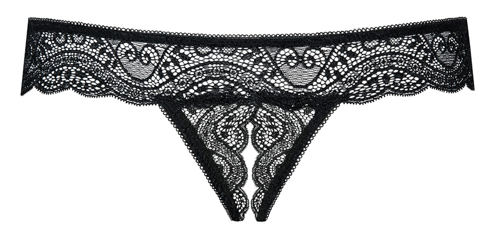 Rio string van zacht, rekbaar kant met een iets bredere kanten tailleband. Open bij het kruis en over de bips voor erotische escapades.