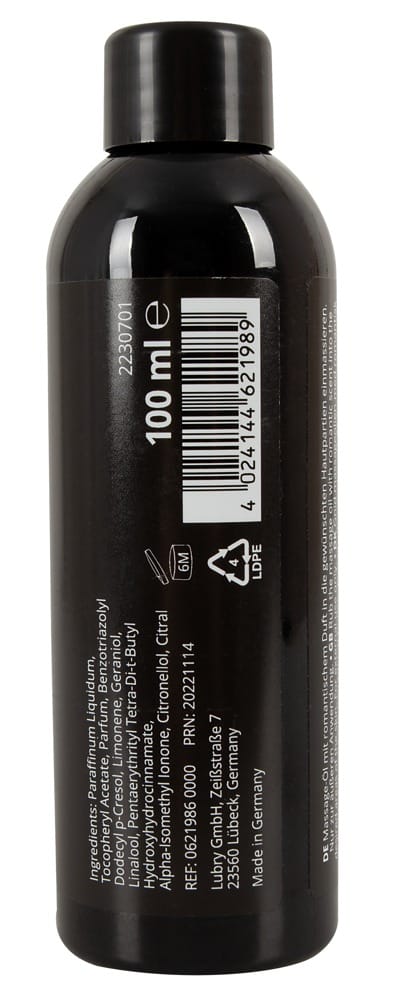 Hoogwaardige, voedende erotische massageolie met een sensuele romantische geur. In water oplosbaar. Langdurige smering. Gemaakt in Duitsland.