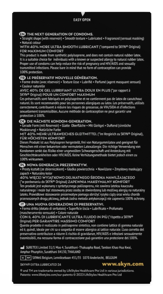 Transparante, extra dunne condooms van SKYN met 40% meer glijmiddel op siliconenbasis voor zachte sensuele ervaringen met comfort. Gemaakt van Sensoprene (Poylisoprene): Zijdezacht en aangenaam om aan te raken, latexvrij en geurloos – ideaal voor latexallergieën en -gevoeligheden. Met reservoir. Veganistisch.