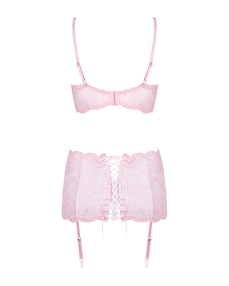 Beugelbeha, jarretelgordel en string in de Girlly set van Obsessive. Zacht wit stretchmateriaal met rozekleurig elastisch kant. Licht gewatteerde beugel-bh op de rug met verstelbare haakjessluiting. De bandjes kunnen op maat worden versteld, net als de jarretelgordel. De brede jarretelgordel heeft een variabele vetersluiting aan de achterkant.