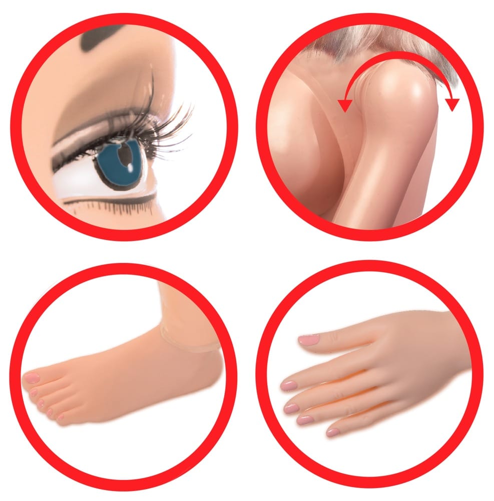 Deze liefdespop kijkt de kijker sensueel aan met haar verleidelijke 3D-gezicht en lange blonde haren. De handen en voeten zijn ook gevormd en nodigen uit om ze te strelen, terwijl de parmantige borsten met stevige tepels boeien. De twee genotskanalen bevinden zich in een masturbator die uitneembaar is en het schoonmaken vergemakkelijkt. De masturbator is aan de binnenkant gestructureerd.