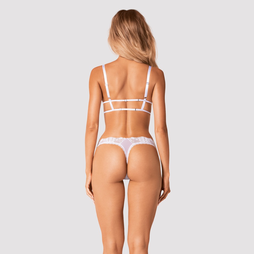 Hemels setje van Obsessive met zachte bh en string. Gemaakt van wit fijn mesh en gezet in een verleidelijk ton-sur-ton design met prachtig bloemenkant. Overal zacht en elastisch voor een hoog draagcomfort. Langer uitgesneden zachte beha met twee haaksluitingen op de rug, die net zo verstelbaar zijn als de bandjes.