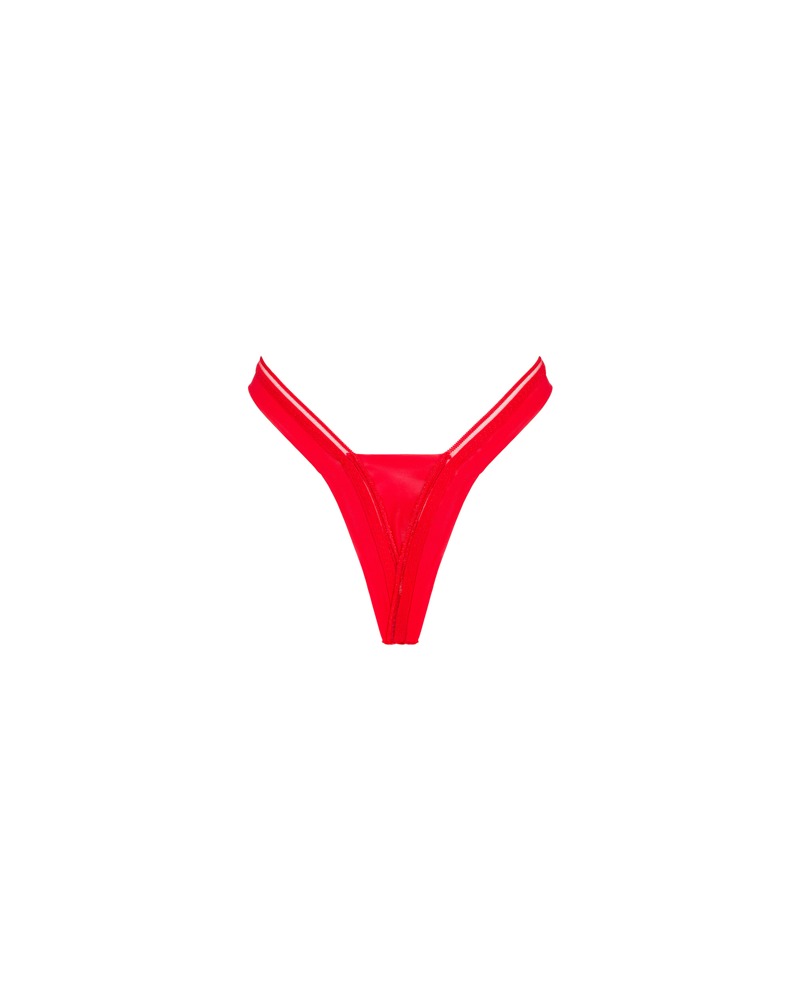 Koraalrode Larisya string van Obsessive met een prachtig geborduurde voorkant en zachte, transparante opengewerkte stretch bandjes. De iets hogere snit benadrukt de sexy bips en benen.