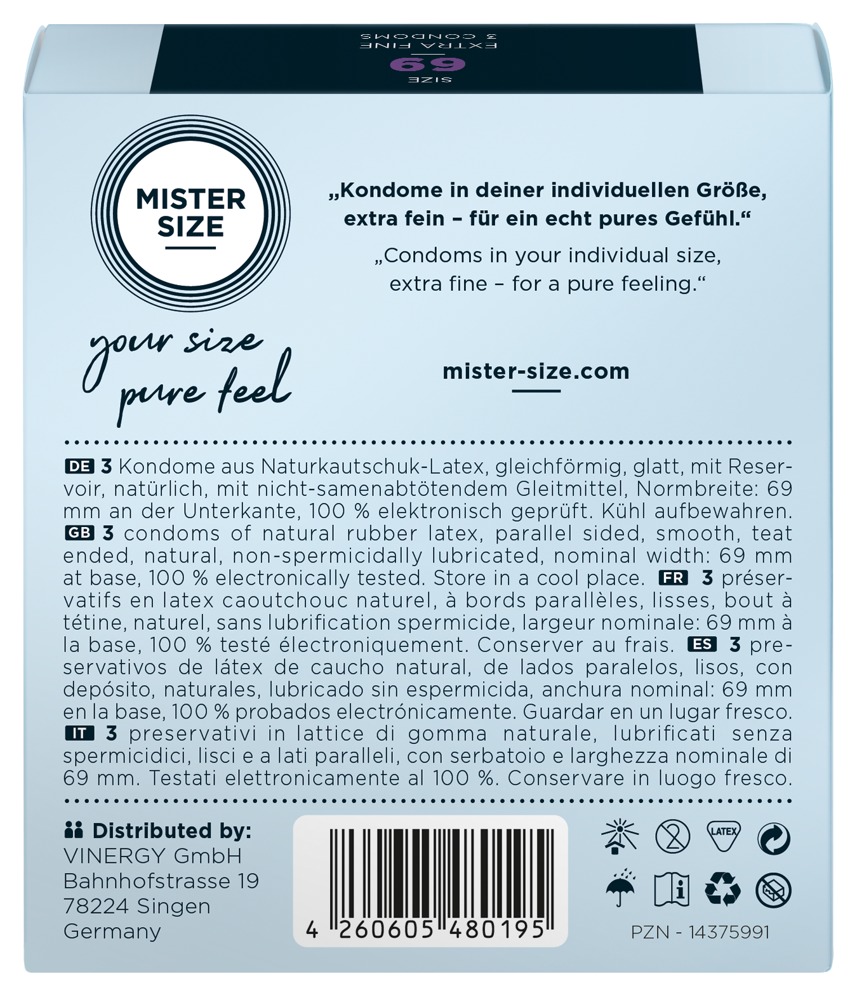 Transparante, flinterdunne Mister Size condooms (69 mm) van natuurlijk rubberlatex met glijmiddellaagje en reservoir. Veganistisch.