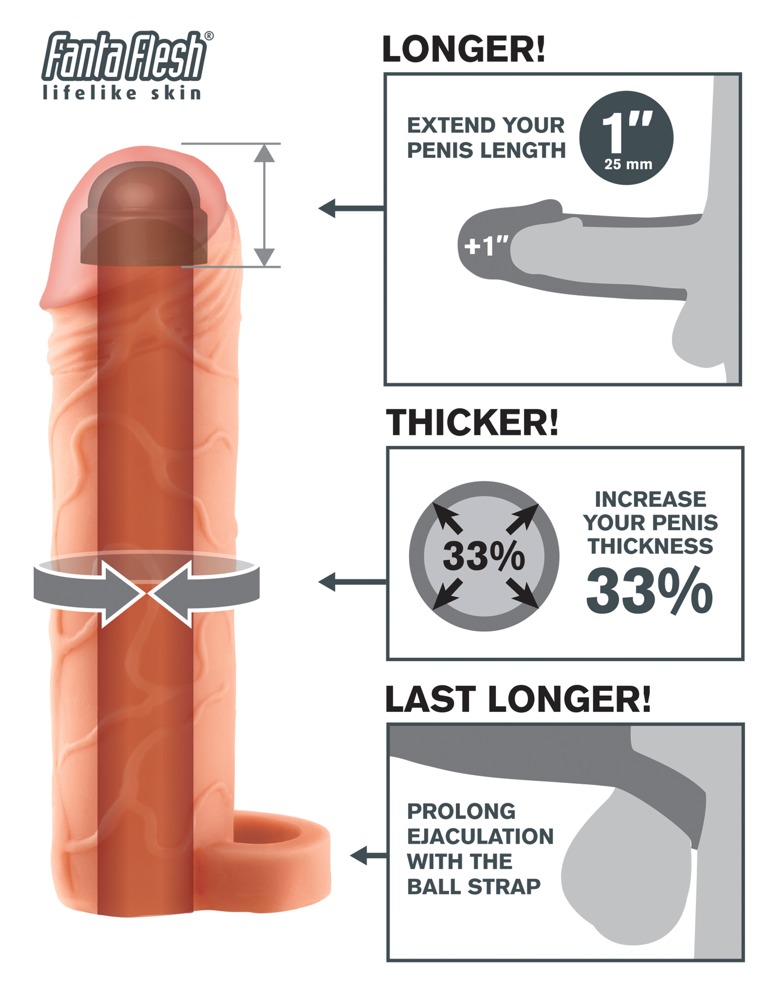Penisschede met sterke adering en stevig gevulde eikel, die de penis met 2,5 cm verlengt. Verdikt de penis met 33% en zorgt tegelijkertijd voor ondersteuning van de erectie. De flexibele testikelring zorgt voor een bijzonder stevige pasvorm en een heerlijk aangrijpend gevoel.