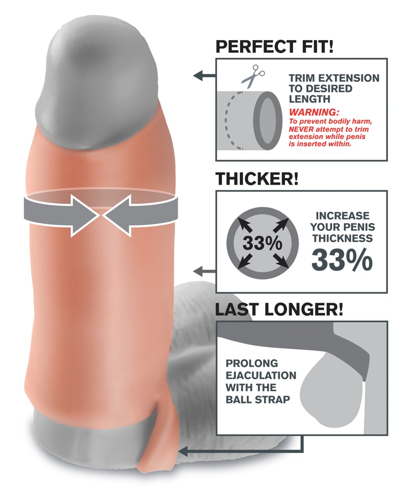 Deze penishoes van huidachtig, zacht stretchmateriaal (Real Feel) brengt de penis in topvorm voor het vervullen van lustmomenten. De nauwsluitende hoes wordt gewoon over de penis in erectie geschoven en zorgt dankzij de testikelring voor een stevige en comfortabele pasvorm zonder uit te glijden. Dankzij de prachtige buitendiameter is de penis 33% groter in omtrek. De schede is aan de bovenkant open om de gevoelige eikel bloot te leggen en kan indien nodig met een schaar worden ingekort voor een perfecte pasvorm.