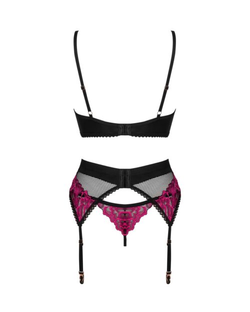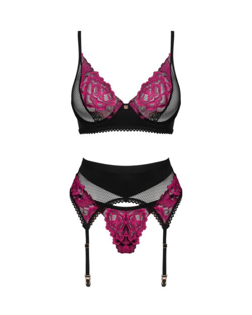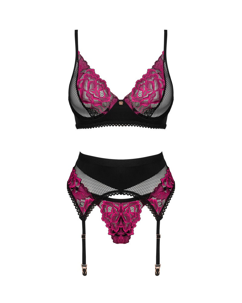 elegant 3-delig jarretelsetje Rosenty van Obsessive met beugelbeha, jarretelgordel en string. Zacht zwart mesh en fijn roze rozenkant in een stijlvolle mix met ondoorzichtig zwart stretchmateriaal. Beha met decoratief element tussen de beugelcups en verstelbare haaksluiting op de rug. De bandjes kunnen ook op maat worden versteld. Net als de jarretelbandjes en de haaksluiting op de jarretelgordel.