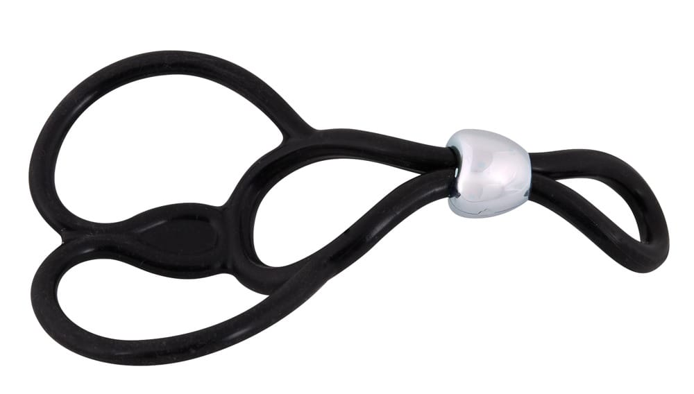 Penisring met twee testikelringen (Ø ca. 3 cm elk, rekbaar). Penisring kan individueel worden aangepast met behulp van een schuifkraal. Totale lengte ca. 13 cm. Zwart.