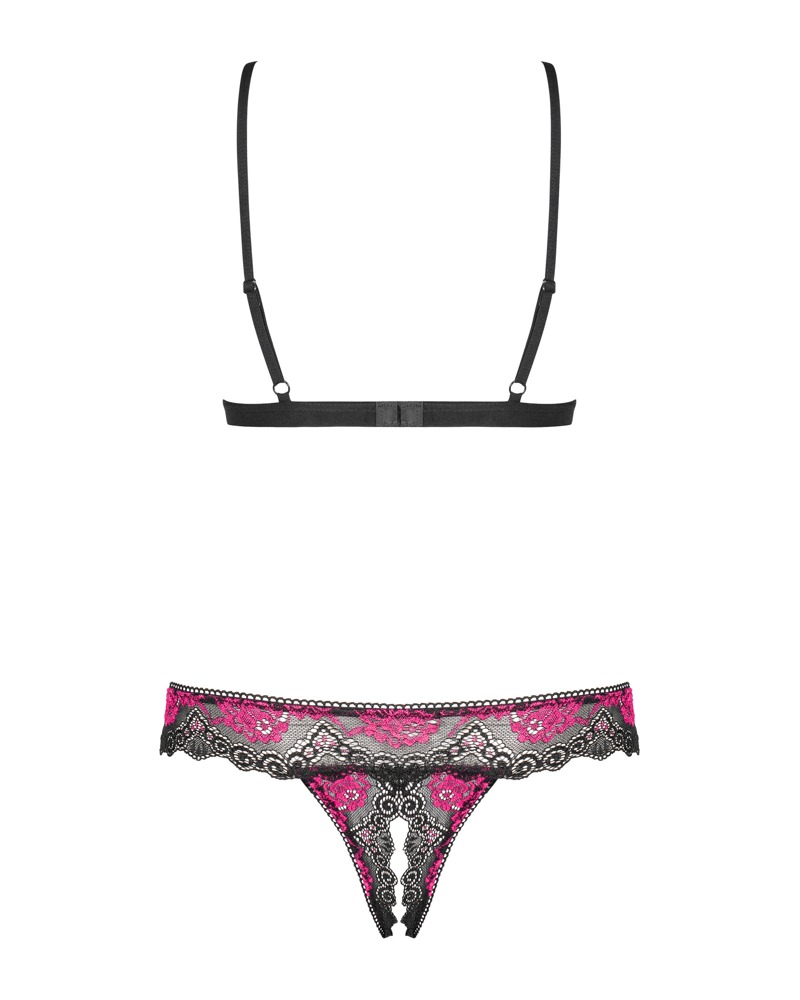 Tulia kruisloos setje van Obsessive met zachte beha en string. Gemaakt van prachtig 2-kleurig kant in zwart en roze – overal zacht en rekbaar voor een hoog draagcomfort. Versierd met strikjes tussen de open cups en op de tailleband van de kruisloze string. De bh-bandjes en de haaksluiting op de rug kunnen op maat worden versteld.