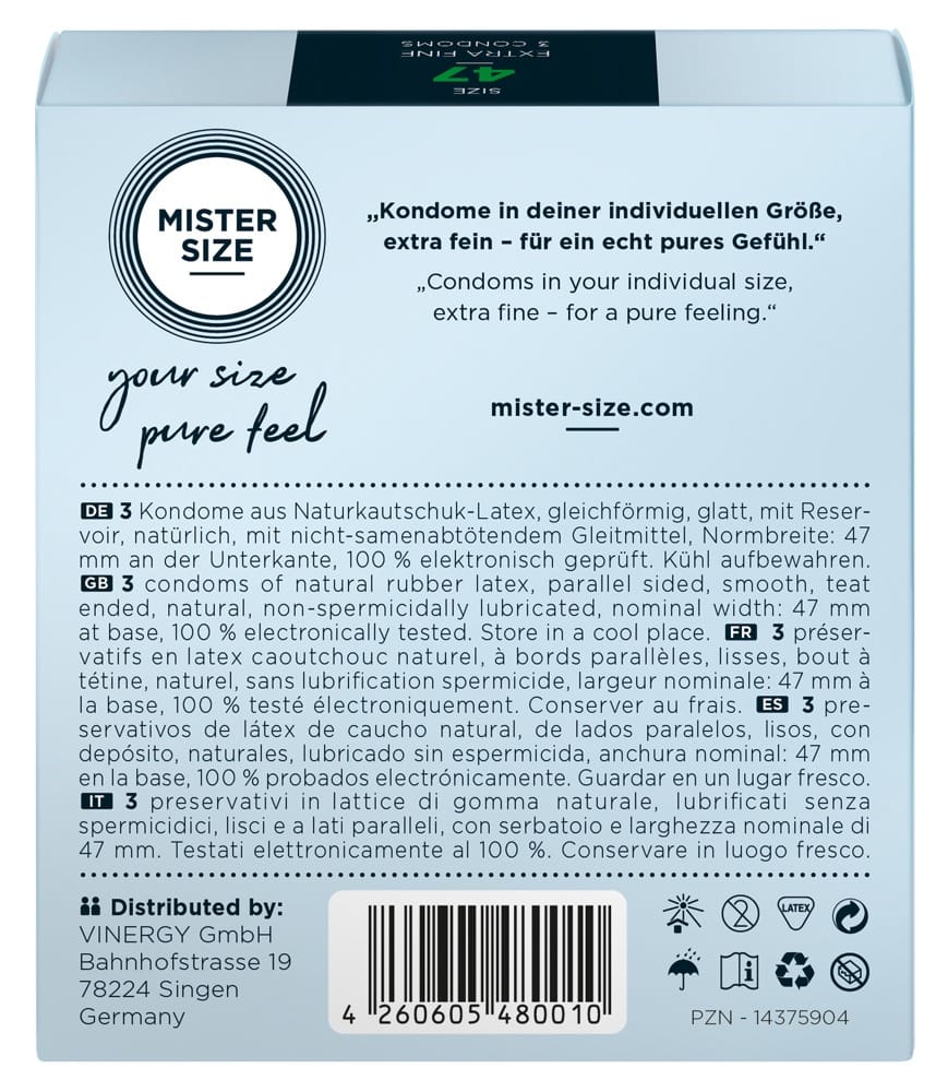 Op de voorkant van de verpakking kan de breedte van de donkerblauwe middenstreep gebruikt worden om de juiste condoommaat voor de penis in te schatten. Maat 47 mm is geschikt voor een penisomtrek van 9,5 tot 10 cm.