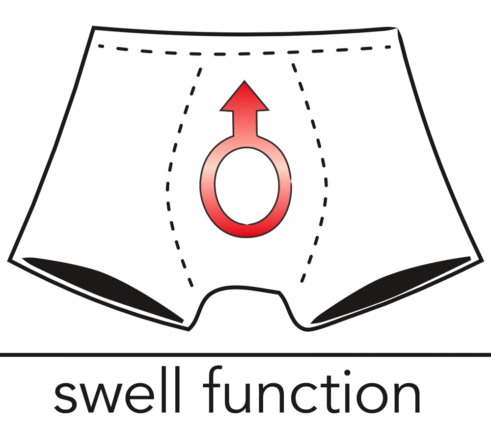String van Svenjoyment met zwelfunctie. Licht gewatteerd in rode lak glans met zwarte contrasten. Brede comfortabele geweven elastische tailleband.